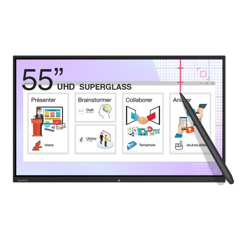 Se entrega con un módulo OPS i5. La pantalla interactiva Speechi Touch Pro ofrece además del paquete Microsoft Office 2016, un paquete de programas con todas las funcionalidades colaborativas que esperan las empresas (brainstorming, presentaciones , animaciones, colaboraciones a distancia, etc, y una cámara Full HD para sus visioconferencias.